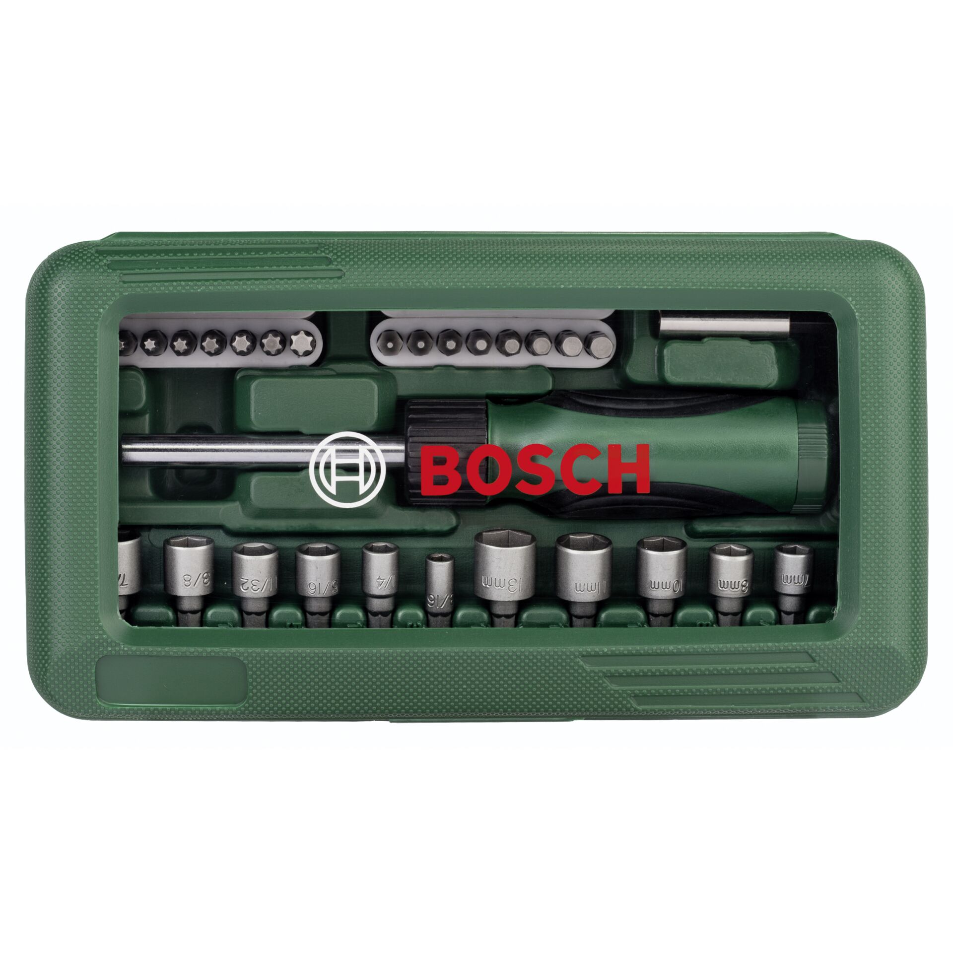 32 Schrauberbits L = 30 mm, PH 0/1/2/3, PZ 0/1/2/3, S 3/4/4,5/5/6/7/8/9, HEX 1,5/2/2,5/3/4/5/5,5/6, T 8/10/15/20/25/27/30/40, 12 Steckschlüssel für Sechskantschrauben, 3/16", 1/4", 5/16", 11/32",3/8",7/16",, 6, 7, 8, 10, 11, 13 mm, 1 Universalhalter, magnetisch, 1 Handschraubendreher, Ratschenfunktion, im Uhrzeigersinn/entgegen dem Uhrzeigersinn, Bit Garage im Handgriff